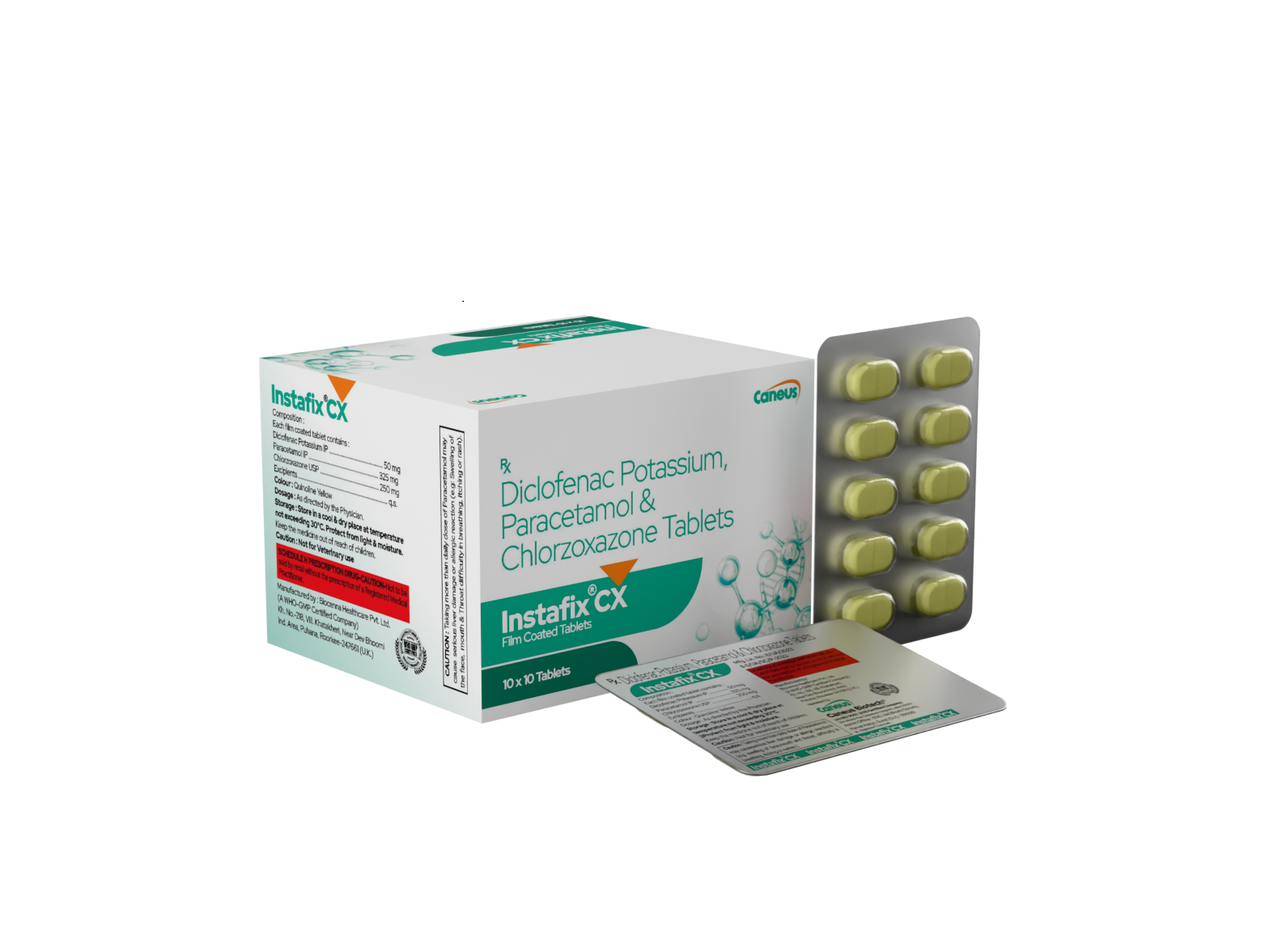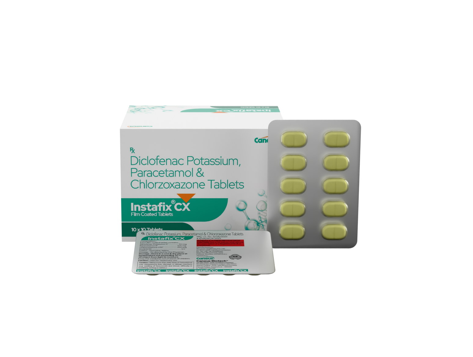 Instafix CX tablets, containing Diclofenac Potassium (50 mg), Paracetamol (325 mg), and Chlorzoxazone (250 mg), are formulated to provide effective relief from muscle spasms and associated pain. This combination offers a comprehensive and convenient solution for managing musculoskeletal discomfort, helping individuals regain mobility and comfort in their daily activities.