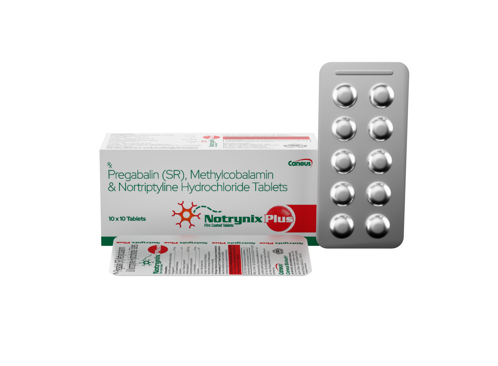 Notrynix Plus (Pregabalin, Nortriptyline, and Methyl Cobalamin) are commonly used in combination to manage neuropathic pain. Pregabalin is an alpha-2 delta ligand that works by decreasing pain perception by modulating calcium channels in nerve cells, reducing the excitability of nerves. Nortriptyline, a tricyclic antidepressant, helps by increasing the levels of serotonin and noradrenaline, which inhibit the transmission of pain signals to the brain, effectively reducing pain perception. Methyl Cobalamin, a bioactive form of vitamin B12, plays a crucial role in nerve health. It supports the production of myelin, a protective sheath surrounding nerve fibers, which helps maintain nerve cell integrity and promotes the regeneration of damaged nerve tissue. Together, Pregabalin, Nortriptyline, and Methyl Cobalamin offer a comprehensive approach to alleviating neuropathic pain by targeting different aspects of nerve function-calcium channel modulation, neurotransmitter regulation, and nerve repair. This combination provides effective relief by addressing both the symptoms and underlying causes of neuropathic pain.